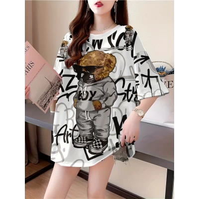 レディース オーバーサイズ ルーズフィット ロングライン Tシャツ - 大胆な文字プリント ラウンドネック 半袖トップ、ミディアムストレッチ カジュアル 夏春秋用 ティー、洗濯機可 春のファッション トレンディグラフィックティー、透けない生地